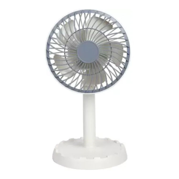 এটি একটি ছোট টেবিল ফ্যান, যা রিচার্জেবল এবং নীল রঙের এলইডি লাইটযুক্ত।
